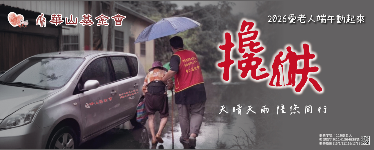 在社會角落裡,許多孤老因經濟窘迫、身體失能,長年生活在寂寞中。端午的粽葉飄香,更顯孤寂,在無助中,等待有一份依靠。 華山基金會本著關懷三失(失依、失能、失智)長輩,發起2026常年服務暨「愛老人 端午動起來」公益行動,盼「天晴天雨 陪您同行」,呼籲全民一起關懷長者。 【愛老人行動】 《建站計畫》幫助一個站,守護100個老人。 建站150萬/站:每3萬人設一個愛心天使站。 福氣磚6,000元/磚:認助天使站福氣磚。 《到宅服務車》執行老人到宅服務,含每月訪視、陪同就醫、取藥、活動參與、物資協助...等。公務車未來5年必要支出,含保險費.燃料稅.牌照稅及每月基礎保養。 到宅服務車:100萬/輛 隨喜 《1250因為有您》支持常年服務項目:1.關懷訪視 2.身體照顧服務 3.家務及日常生活照顧服務 4.沐浴5.資源連結服務 6.生活品質促進 7.其他 因為有您1,250元/位/月。 因為有您15,000元/年/位。(1250元*12個月=15,000元) 隨喜 《端午關懷禮》於台澎金馬送近3萬份端午關懷禮,倘有結餘作為常年服務經費。 端午關懷禮600元/份 【其他參與方式】 Google雲端下載:信用卡授權書/郵局自動轉帳付款授權書/ACH定期定額轉帳授權書/劃撥單 1.信用卡授權捐款,請填寫信用卡授權書 2.郵局自動轉帳,請填自動轉帳付款授權書 3.銀行定期定額轉帳,請填寫ACH定期定額轉帳授權書 4.郵政劃撥下載劃撥單 或 郵政帳號:194-194-26 戶名:華山基金會 通訊欄備註:115端午 郵政轉帳:7000010-1941-9426 (請於轉帳後告知轉帳末五碼) 5.銀行匯款/網路或ATM轉帳 銀行代號:台灣銀行(004) 城中分行 銀行帳號:045-001-121-476 戶 名:財團法人華山社會福利慈善事業基金會 轉帳後,請將存根註明收據抬頭 ( 捐款人 )、住址、電話 傳真提供 或來電告知捐款資訊,以便本會開立正式收據 ※本會按月將專案款項匯入勸募指定帳戶 愛心專線:(02)2836-3919 分機215 陳小姐 愛心傳真:(02)2834-7255 E - mail:BB5158@elder.org.tw 【勸募字號】115愛老人衛部救字第1141364538號 【勸募期間】115/1/1至115/12/31 MORE